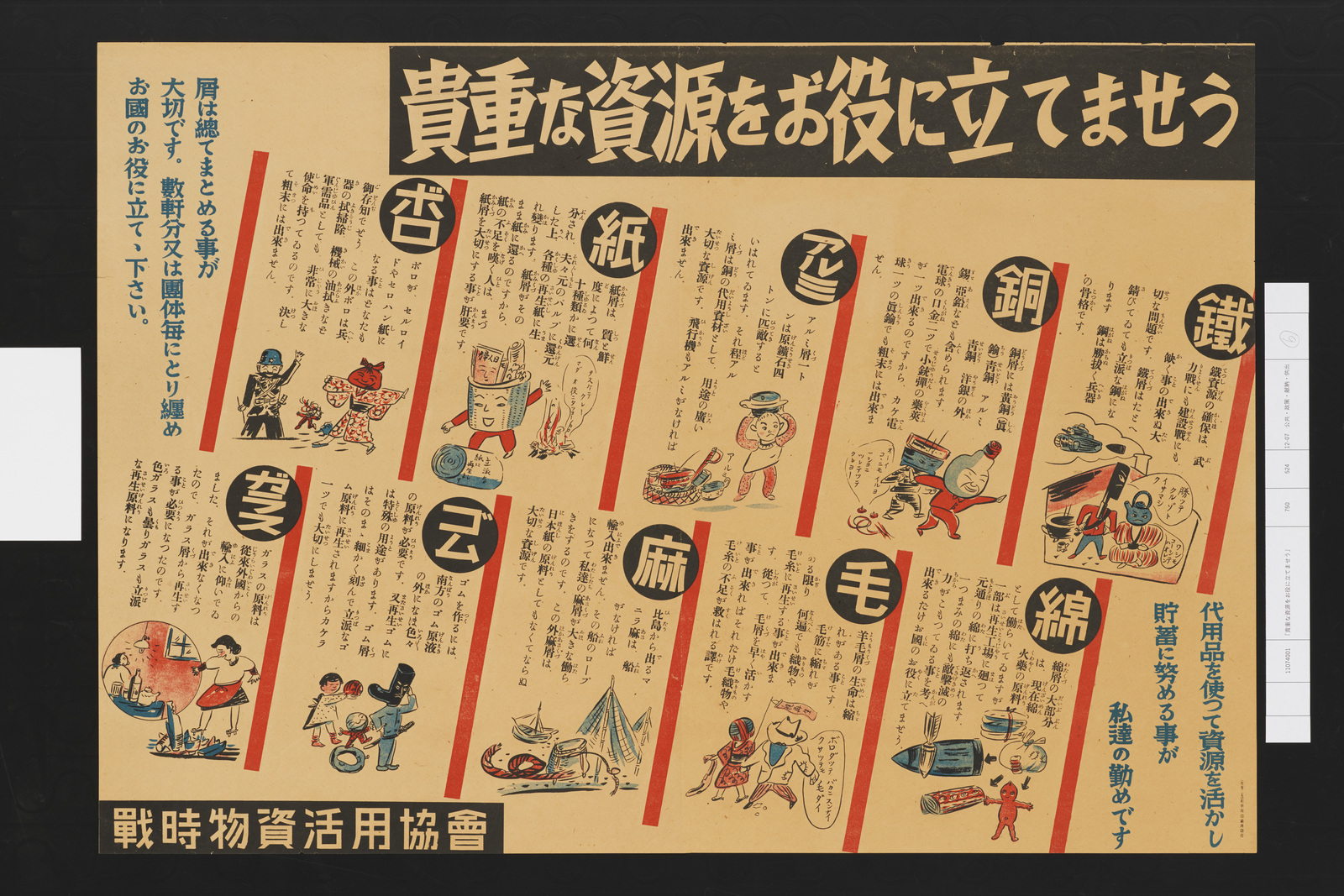 - 貴重な資源をお役に立てませう 鉄 鉄資源の確保は、武力戦にも建設戦にも欠く事のできぬ大切な問題です。鉄屑はたとへ錆びてゐても立派な鋼になります 鋼は勝抜く兵器の骨格です。 銅 銅屑には黄銅(真鍮)青銅、アルミ青銅、洋銀の外、錫、亜鉛などにも含められます。電球の口金二ツで小銃弾の薬莢が一ツ出来るのですから、カケ電球一ツの真鍮でも粗末には出来ません。 アルミ アルミ屑一トンは原鉱石四トンに匹敵するといはれてゐます。それ程アルミ屑は銅の代用資材として、用途の広い大切な資源です。飛行機もアルミがなければ出来ません。 紙 紙屑は、質と鮮度によつて何十種類かに選分され、夫々元のパルプに還元した上、各種の再生紙に生まれ変ります。紙屑がそのまま紙に還るのですから、紙の不足を嘆く人は、まづ紙屑を大切にする事が肝要です。(略)戦時物資活用協会