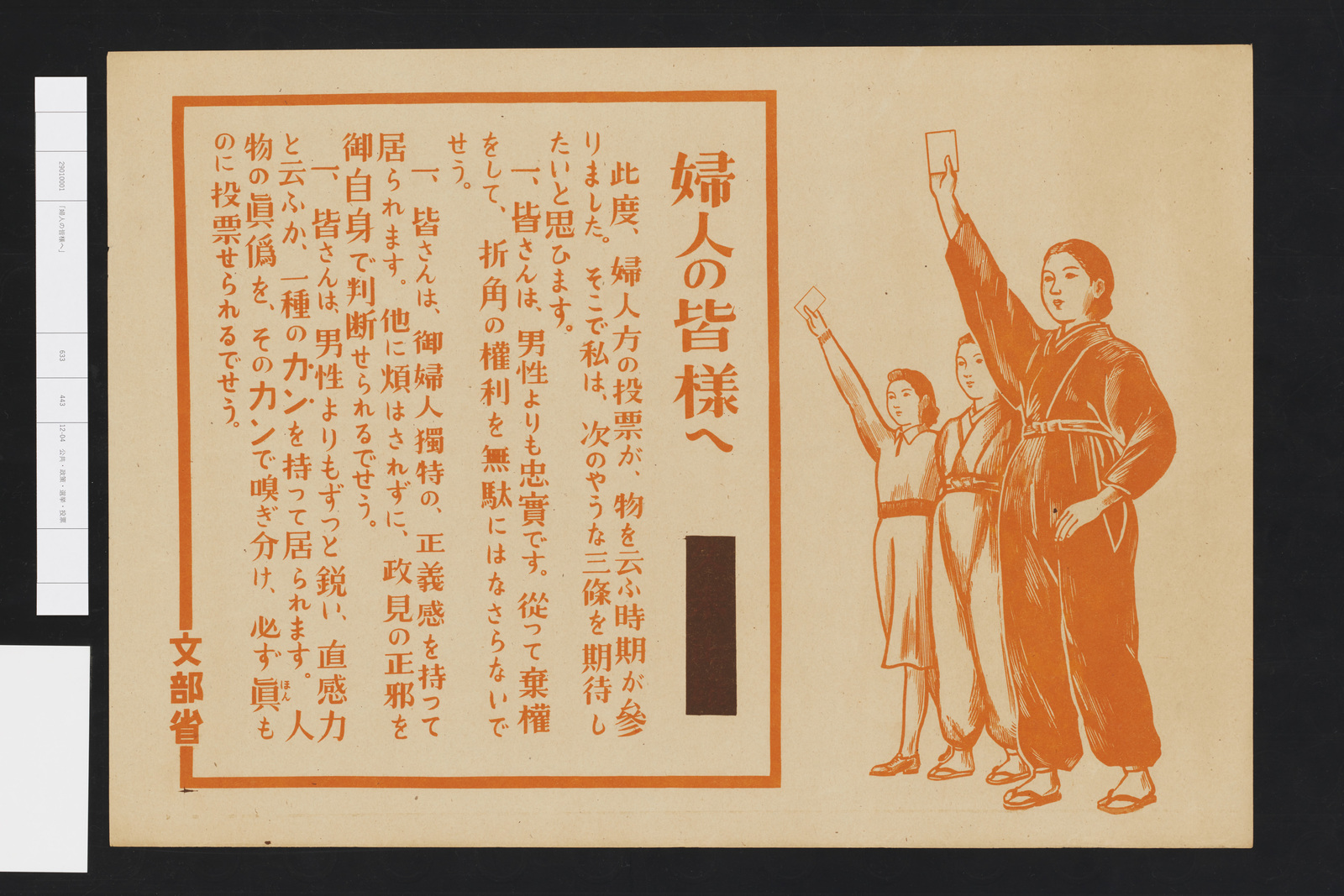 此度、婦人方の投票が、物を云う時期が参りました。そこで私は、次のやうな三條を期待したいと思ひます。 一、皆さんは、男性よりも忠実です。従って棄権をして折角の権利を無駄にはなさらないでせう。 一、皆さんは、御婦人独特の、正義感を持って居られます。他に煩はされずに、政見の正邪をご自身で判断せられるでせう。 一、皆さんは、男性よりもずっと鋭い、直感力と云ふか、一種のカンを持って居られます。人物の真偽を、そのカンで嗅ぎ分け、必ず真ものに投票せられるでせう。 文部省