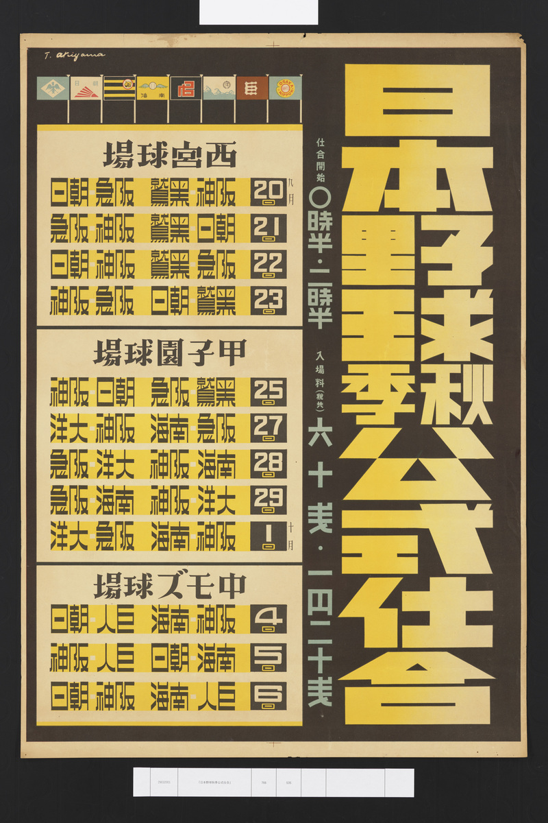 - 日本野球秋期公式仕合 仕合開始0時半・二時半 入場料(税共)六十銭・一円二十銭 西宮球場 20日阪神-黒鷲 阪急-朝日 21日朝日-黒鷲 阪神-阪急 22日阪急-黒鷲 阪神-朝日 23日黒鷲-朝日 阪急-阪神 甲子園球場 25日黒鷲-阪急 朝日-阪神 27日阪急-南海 阪神-大洋 28日南海-阪神 大洋-阪急 十月1日阪神-南海 阪急-大洋 中モズ球場 4日阪神-南海 巨人-朝日 5日南海-朝日 巨人-阪神 6日巨人-南海 阪神-朝日