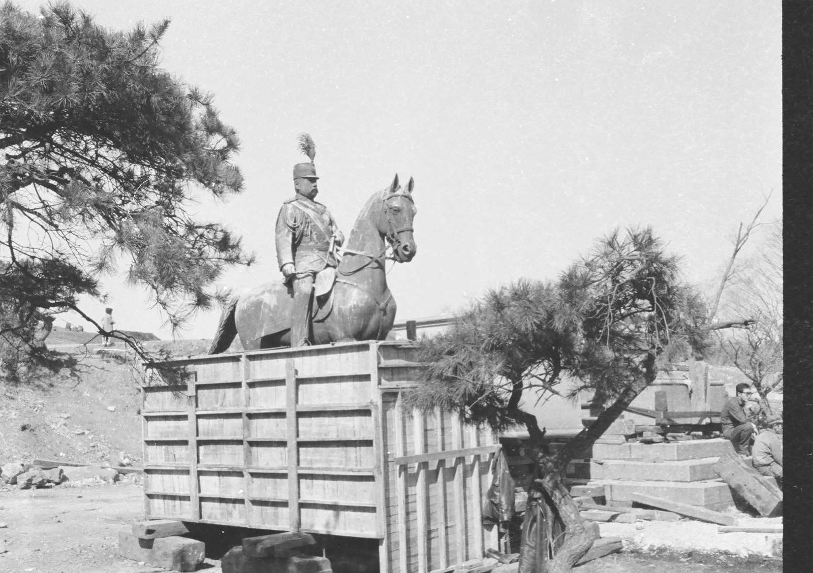 有栖川宮熾仁親王像の移設工事が行われる様子。この銅像は彫刻家の大熊氏廣により制作され、明治36年(1903)に陸軍参謀本部前へ設置された。皇室や皇族に関係するものであったので戦中の金属類回収は免れたが、戦後は逆に撤去対象としてリスト入りすることとなった。しかし、明治時代の美術史上の代表的作品と認められ、撤去されず置存となっていた。首都高速都心環状線の建設と内堀通りの道路拡張のため、昭和37年(1962)3月に陸軍参謀本部跡から有栖川宮記念公園(港区南麻布)へ移設されることとなった。