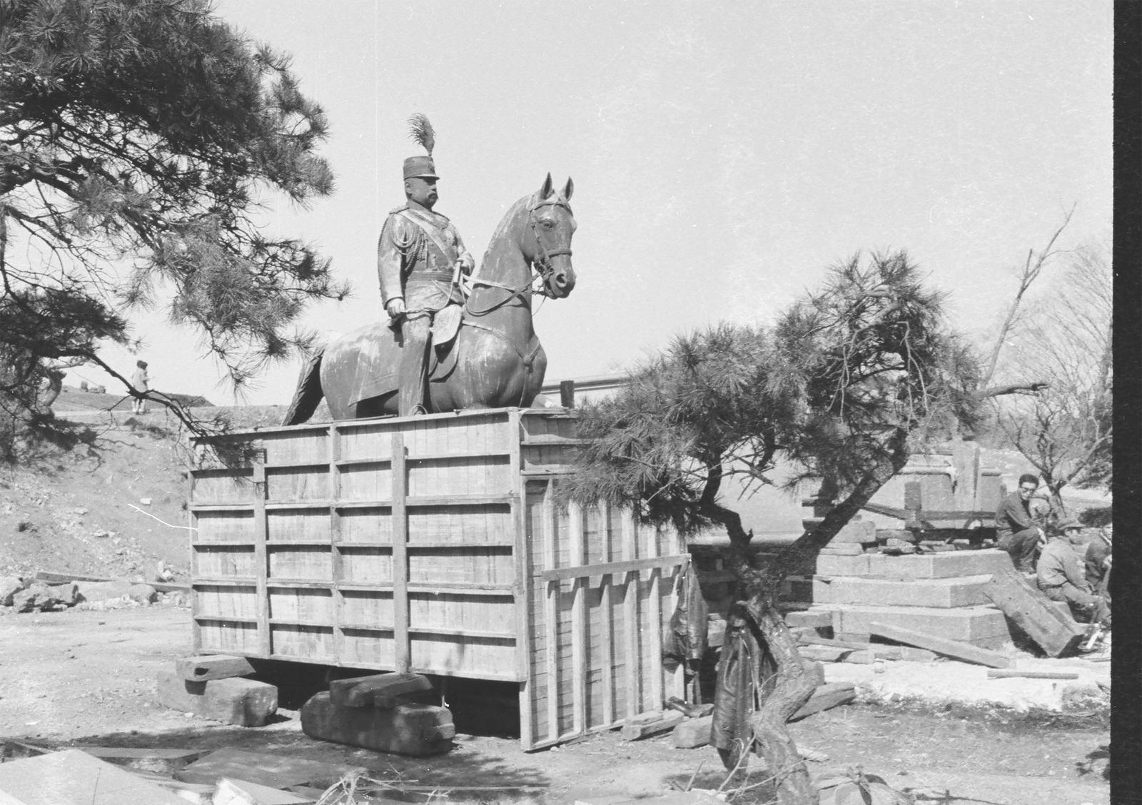 有栖川宮熾仁親王像の移設工事が行われる様子。この銅像は彫刻家の大熊氏廣により制作され、明治36年(1903)に陸軍参謀本部前へ設置された。皇室や皇族に関係するものであったので戦中の金属類回収は免れたが、戦後は逆に撤去対象としてリスト入りすることとなった。しかし、明治時代の美術史上の代表的作品と認められ、撤去されず置存となっていた。首都高速都心環状線の建設と内堀通りの道路拡張のため、昭和37年(1962)3月に陸軍参謀本部跡から有栖川宮記念公園(港区南麻布)へ移設されることとなった。