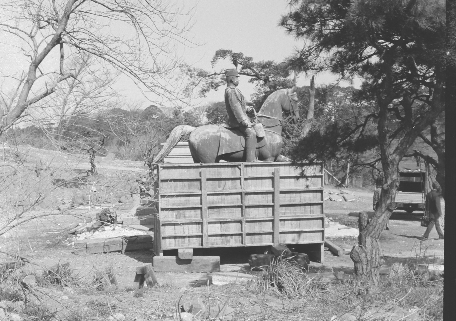 有栖川宮熾仁親王像の移設工事が行われる様子。この銅像は彫刻家の大熊氏廣により制作され、明治36年(1903)に陸軍参謀本部前へ設置された。皇室や皇族に関係するものであったので戦中の金属類回収は免れたが、戦後は逆に撤去対象としてリスト入りすることとなった。しかし、明治時代の美術史上の代表的作品と認められ、撤去されず置存となっていた。首都高速都心環状線の建設と内堀通りの道路拡張のため、昭和37年(1962)3月に陸軍参謀本部跡から有栖川宮記念公園(港区南麻布)へ移設されることとなった。