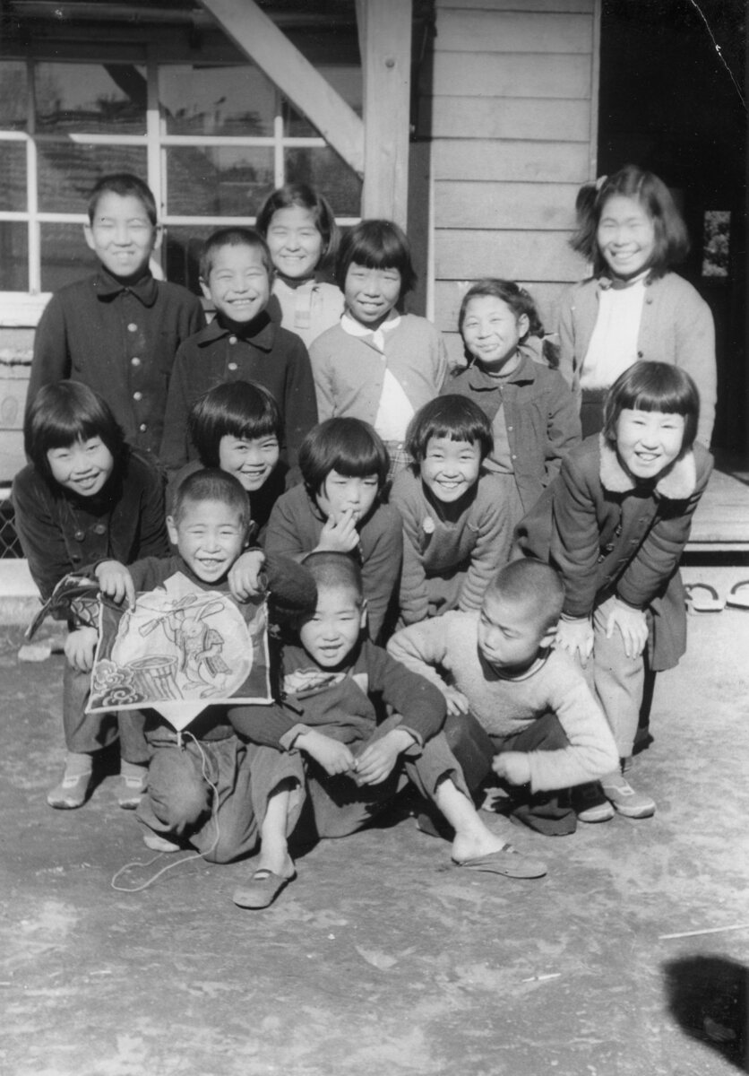 写真カミシバイヲミルタメニアツマッタコドモタチ