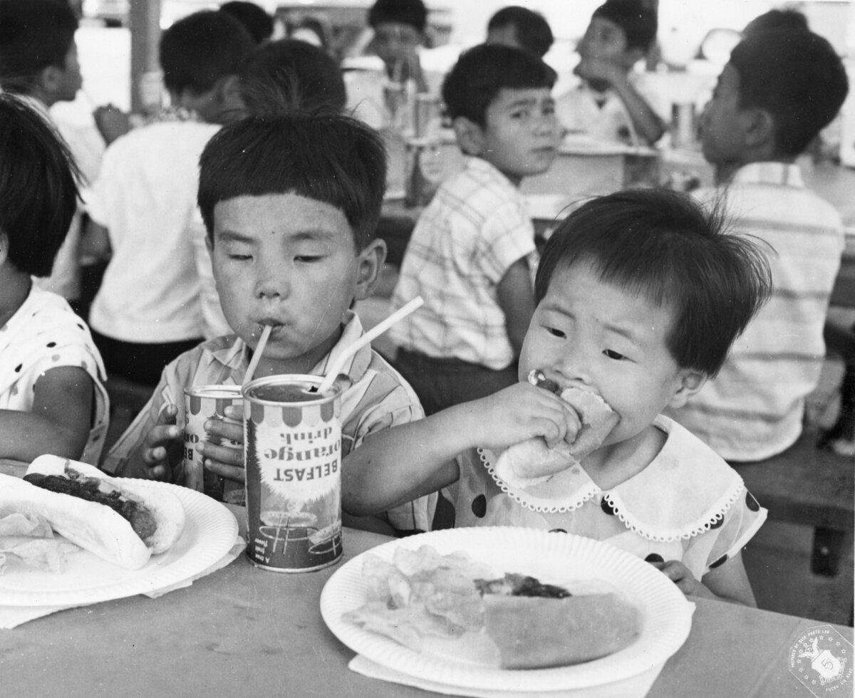 キャンプ・ドレイクに招待された子どもたち。ホットドッグとジュースを食べる子どもたち。