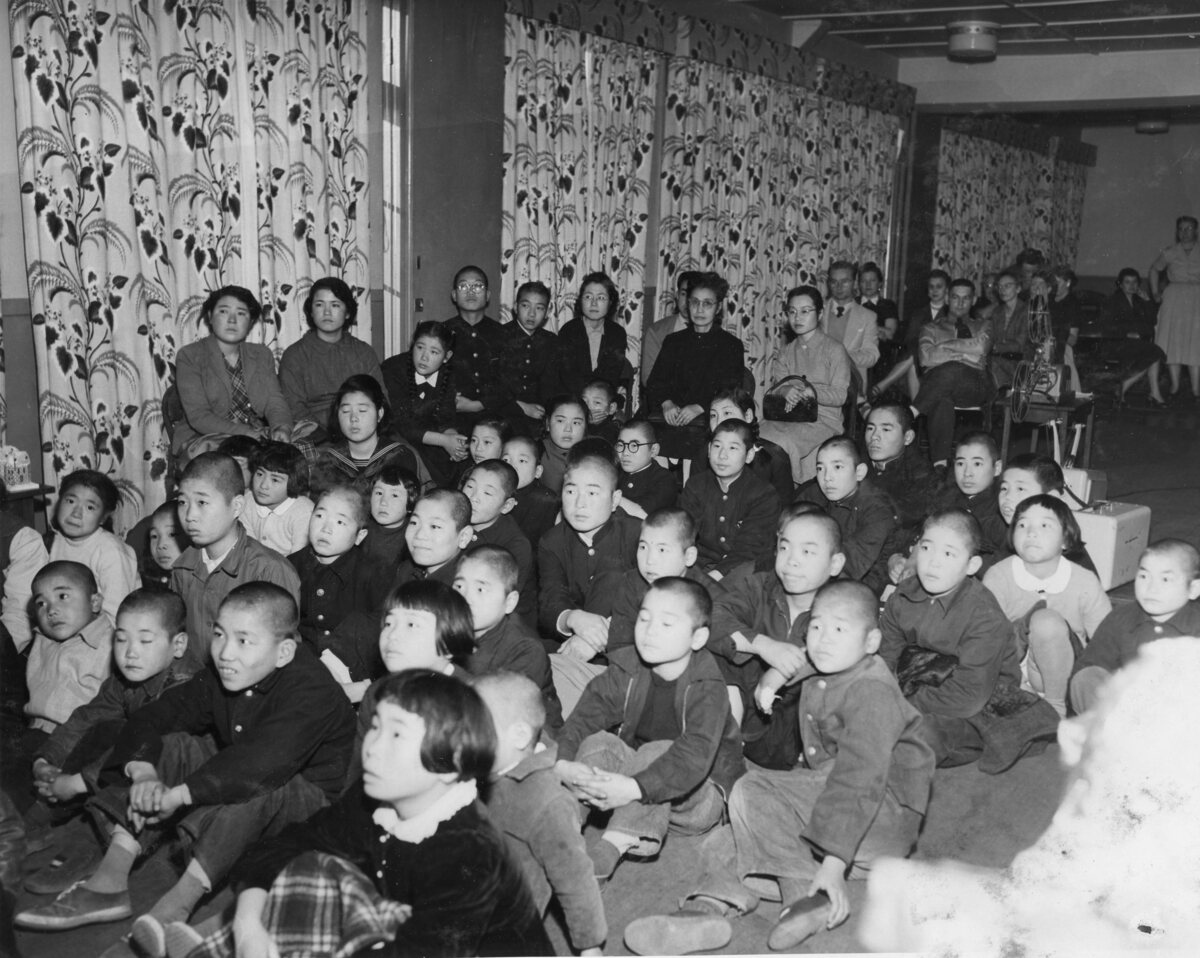 ワシントンハイツでの、アメリカ海兵隊将校夫人クラブのメンバーによるクリスマスパーティー。この日は子どもたちにとって一年中で一番気持ちが豊かになる時だった。クリスマスパーティーは、米軍にとってはキリスト教的な慈善と博愛の精神を内外にアピールし、殺伐としがちな兵士の心理的なケアに重要な役割を果たした。昭和22年(1947)12月には米陸軍憲兵隊長のケンワージーがクリスマスパーティーに子どもたちを招待、以降、海軍、空軍とさまざまな部隊が愛児の家を継続的に支援した。