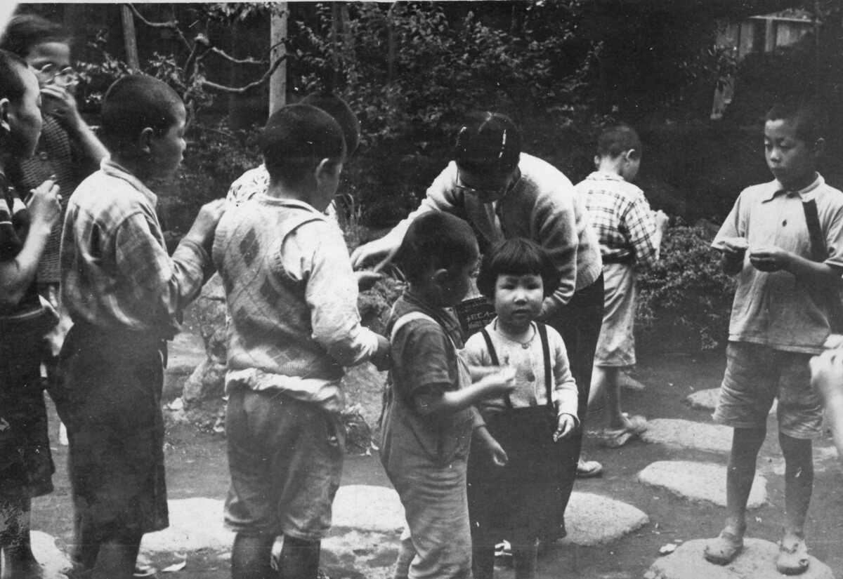 愛児の家の庭でチョコレートを配ってもらう子どもたち。