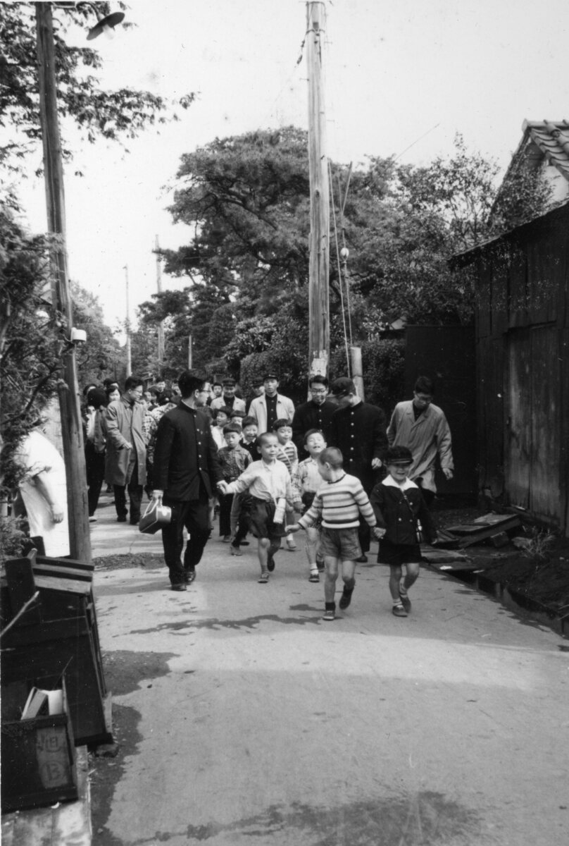 学生服の男子学生と一緒に歩く子どもたち。