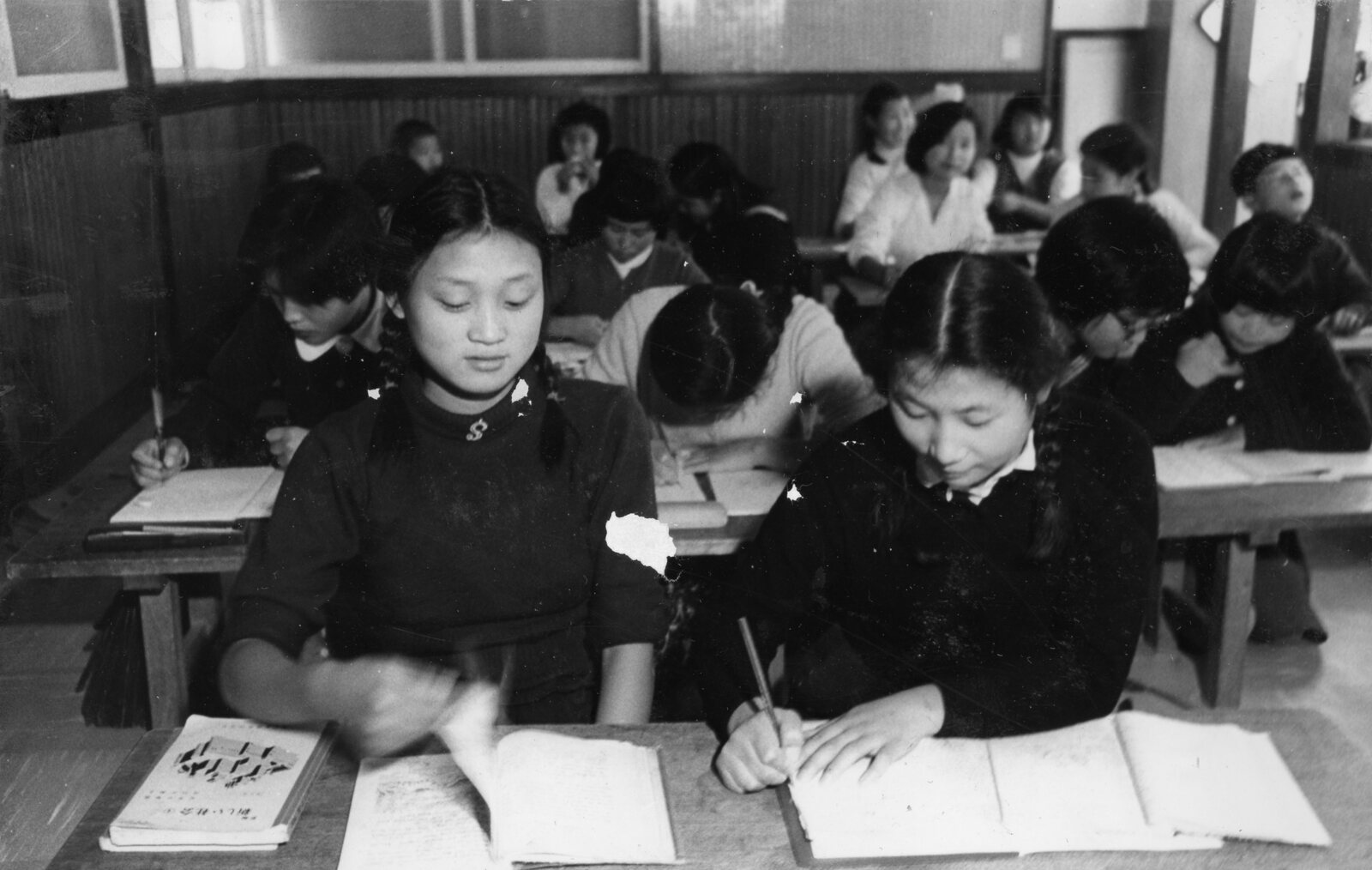勉強する子どもたち。机の上には社会科の教科書が出ている。
