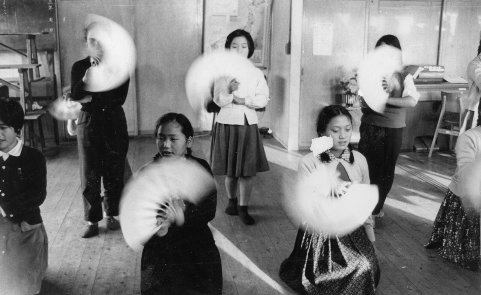 扇子を持って日本舞踊のお稽古をしている子どもたち。