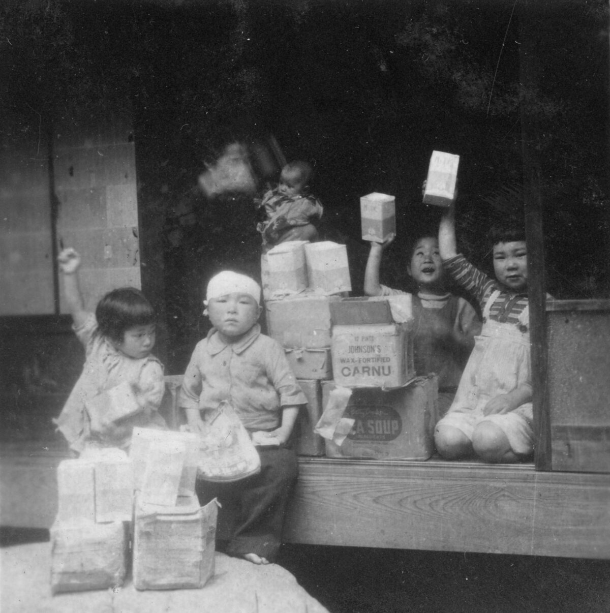 届けられたララ物資を持つ子どもたち。ララ物資は門前にトラックが横づけにされ、子どもたちに配られた。その場で食べるわけではないものの、缶詰や箱を渡され、記念写真を撮られることもあった。調理方法のわからない食糧も多いなかで、人気があったのは「全黄粉」。反故紙を皿代わりにして、粉のまま配り、三時のおやつに食べたという。
