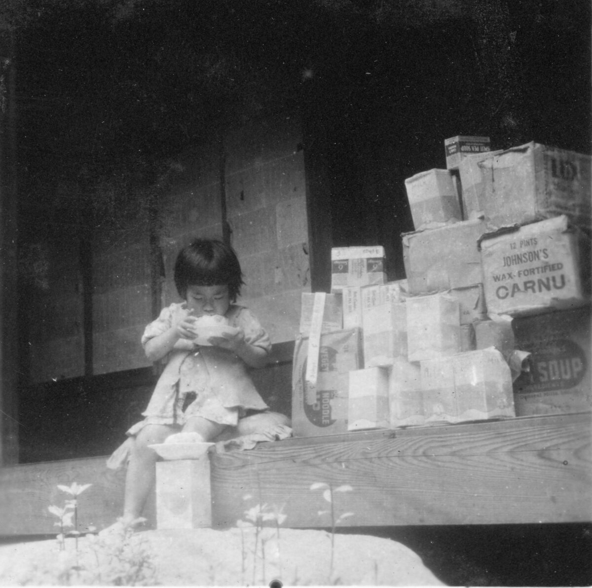 届けられたララ物資を持つ子ども。ララ物資は門前にトラックが横づけにされ、子どもたちに配られた。その場で食べるわけではないものの、缶詰や箱を渡され、記念写真を撮られることもあった。調理方法のわからない食糧も多いなかで、人気があったのは「全黄粉」。反故紙を皿代わりにして、粉のまま配り、三時のおやつに食べたという。