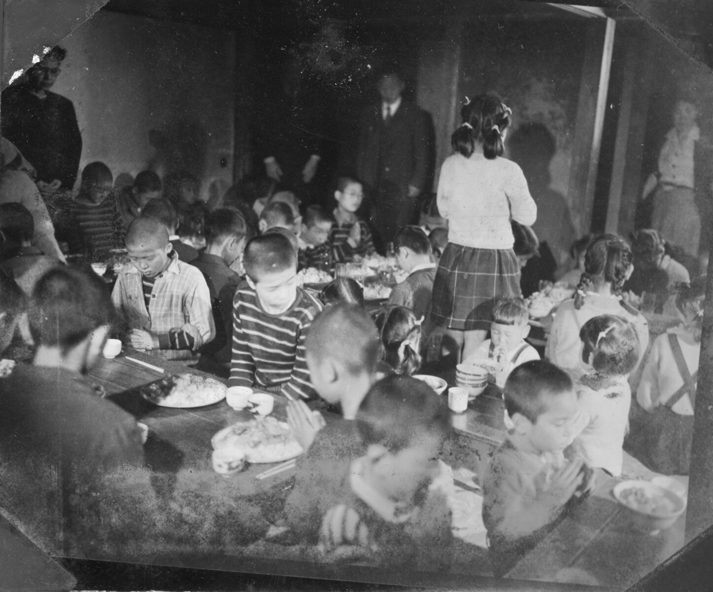 食事の前に手を合わせて「いただきます」をする子どもたち。