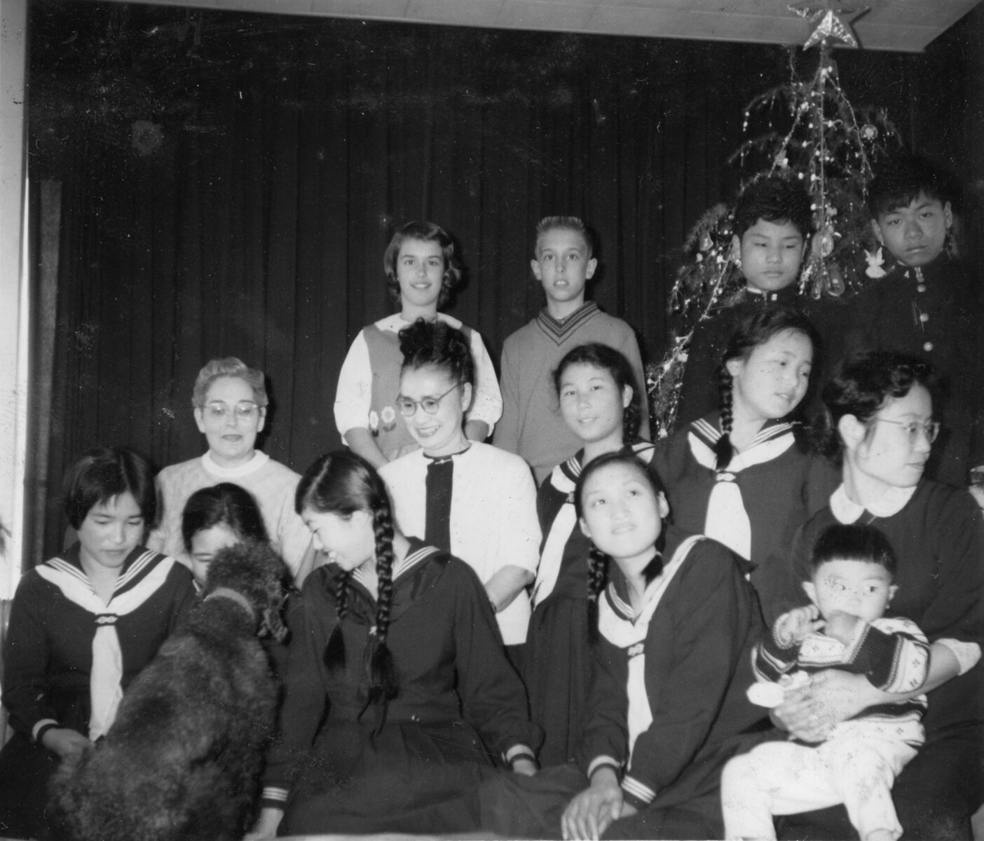 クリスマス会での子どもたちと石綿貞代。背後にクリスマスツリーがある。