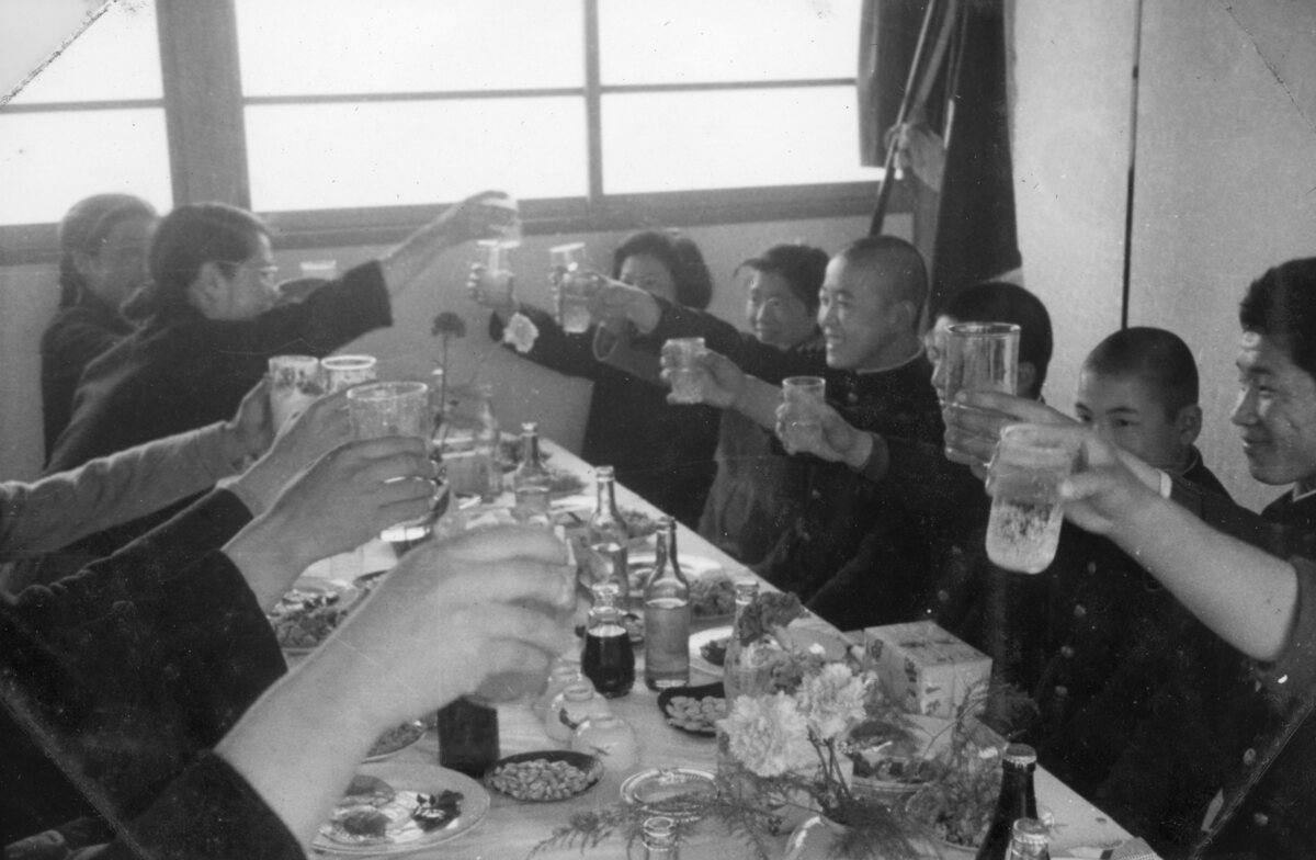 乾杯する子どもたち。デーブルの上には料理のほか瓶のジュースや花瓶がある。