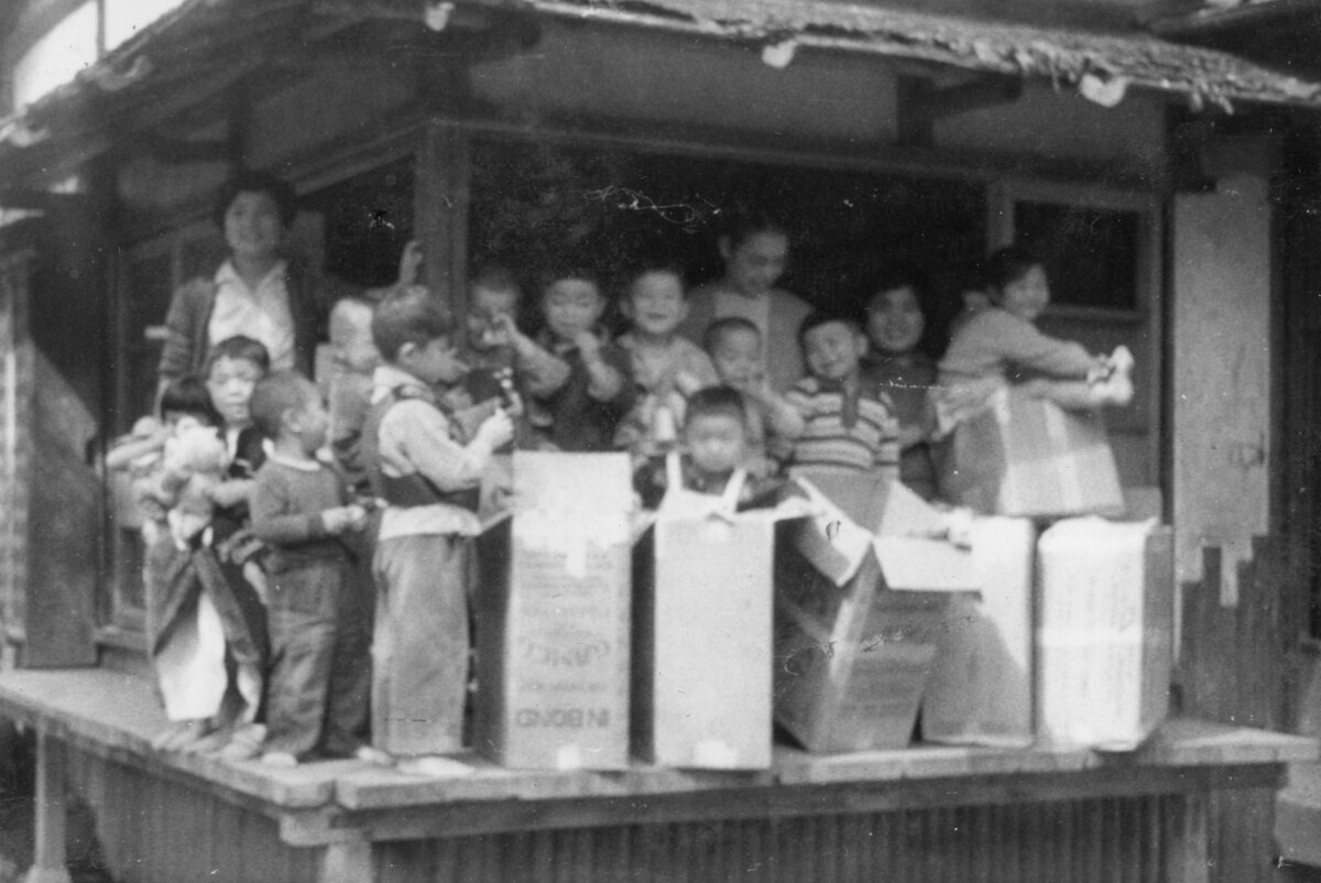 大きな箱を開けて縁側で記念撮影する子どもたち。