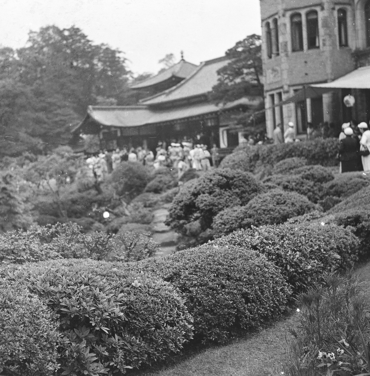 寺のような日本建築と洋風の建物。