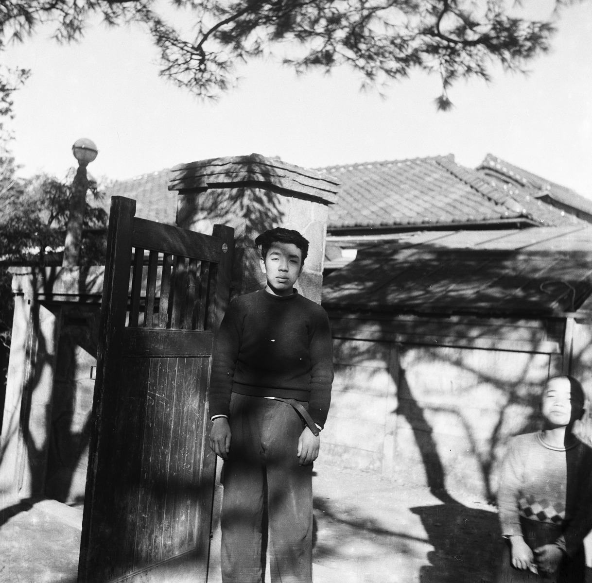 愛児の家の門に立つ男性