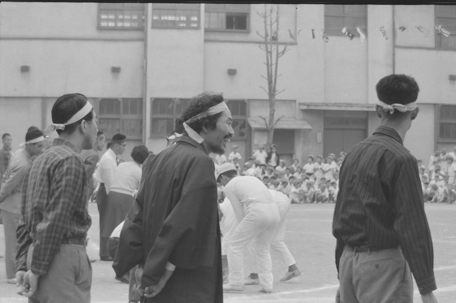 鉢巻を巻いた保護者たち。