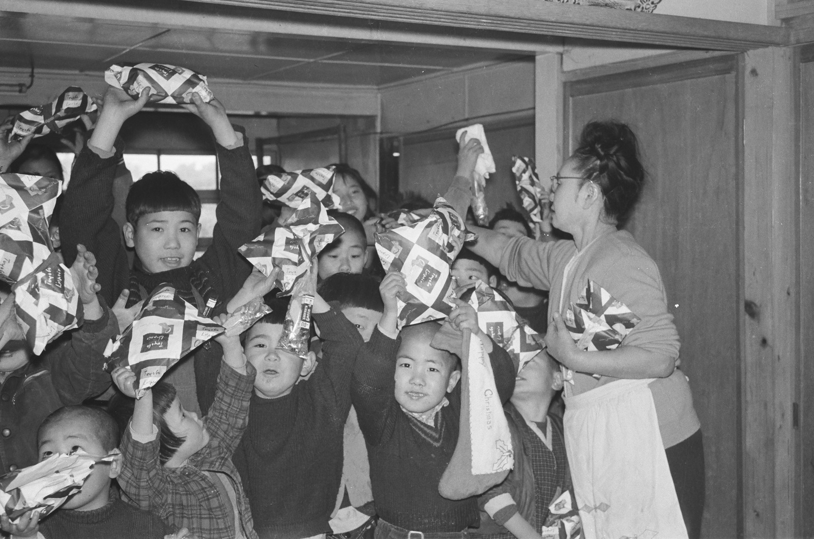 礼状とともに送る、子どもたちの集合写真。子どもたちはアメリカから送られてきたクリスマスプレゼント(お菓子)を持っている。右側にいる男の子は「Happy Christmas」と書かれた袋を持っている。石綿貞代(さたよ)(写真右)は子どもたちにプレゼントを配っている。貞代さんは支援者への礼状や返礼品をとても大切にしていた。米国の支援者への返事は、英語が得意だった長女の及子(ちかこ)が夜を徹して翻訳した。貞代は気にせず日本語で礼状を書いていたという。