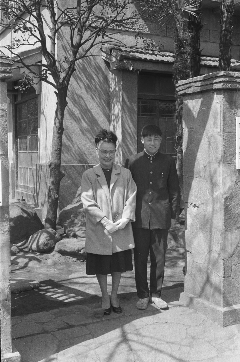愛児の家の門に立つ中学生と石綿貞代。