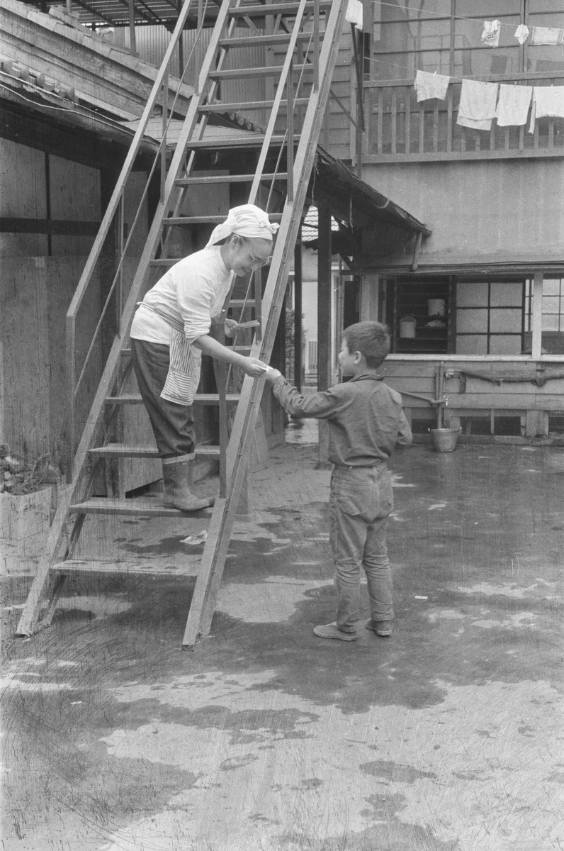 三角巾を巻いて、長靴姿の石綿貞代と男の子。