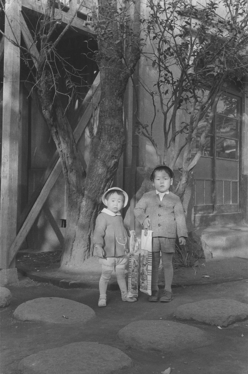 七五三を祝う記念写真。千歳飴を持つ男児と女児。