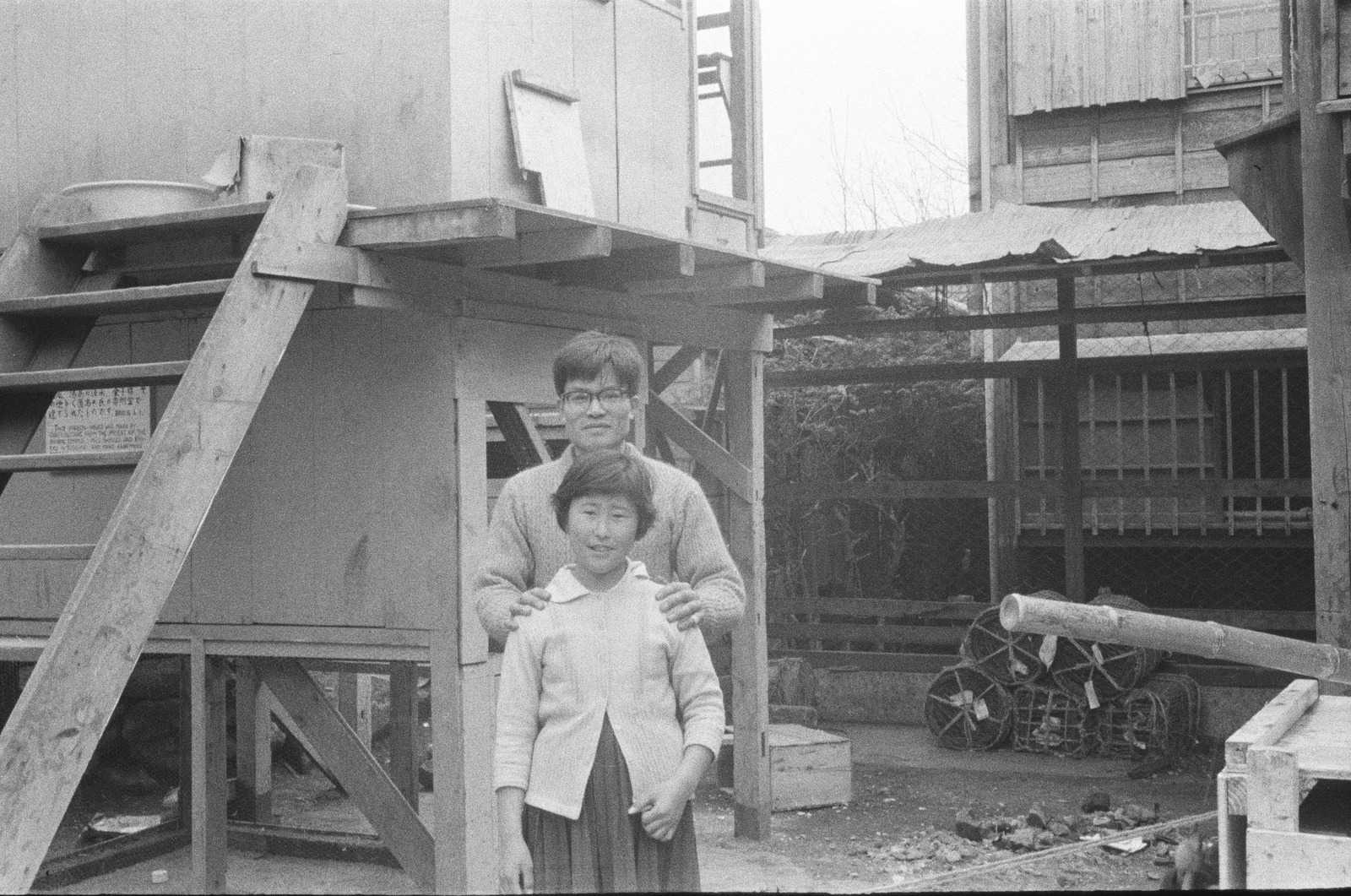 愛児の家の子どもと職員。後ろの建物は鳩舎。