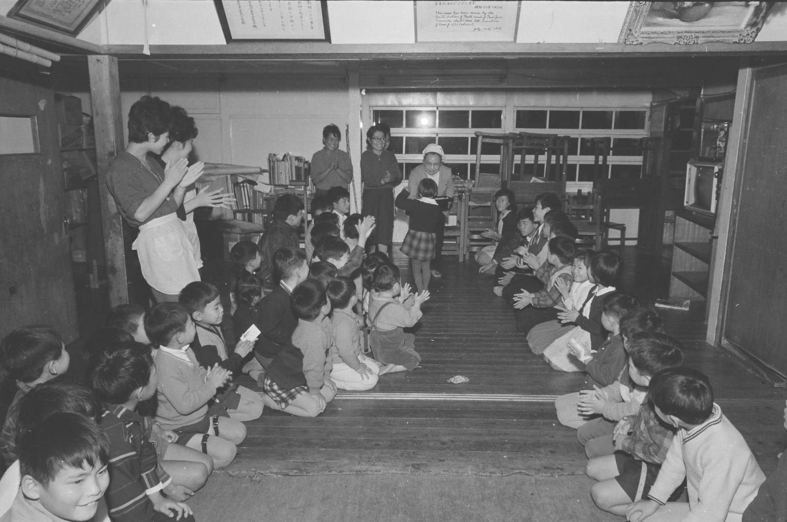 誕生会の余興。拍手する職員や子どもたち。
