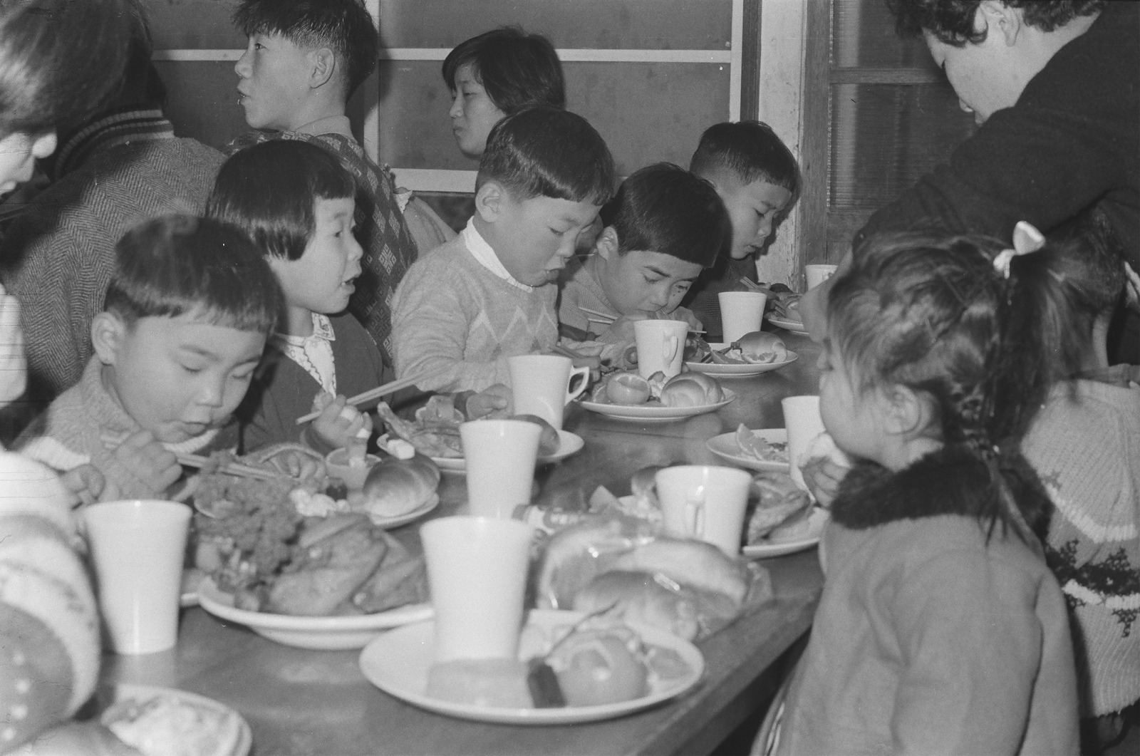 クリスマスの食事を食べる子どもたち。
