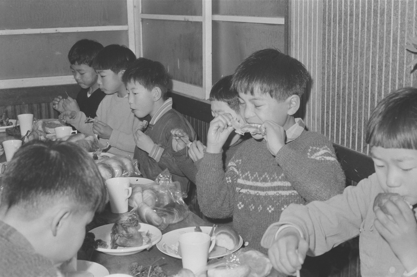 クリスマスの食事を食べる子どもたち。
