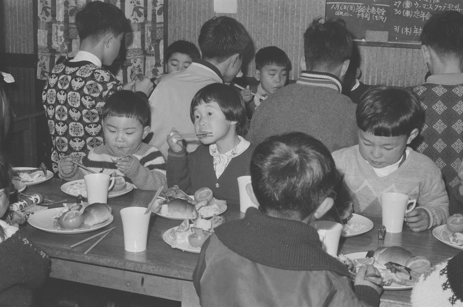 クリスマスの食事を食べる子どもたち。
