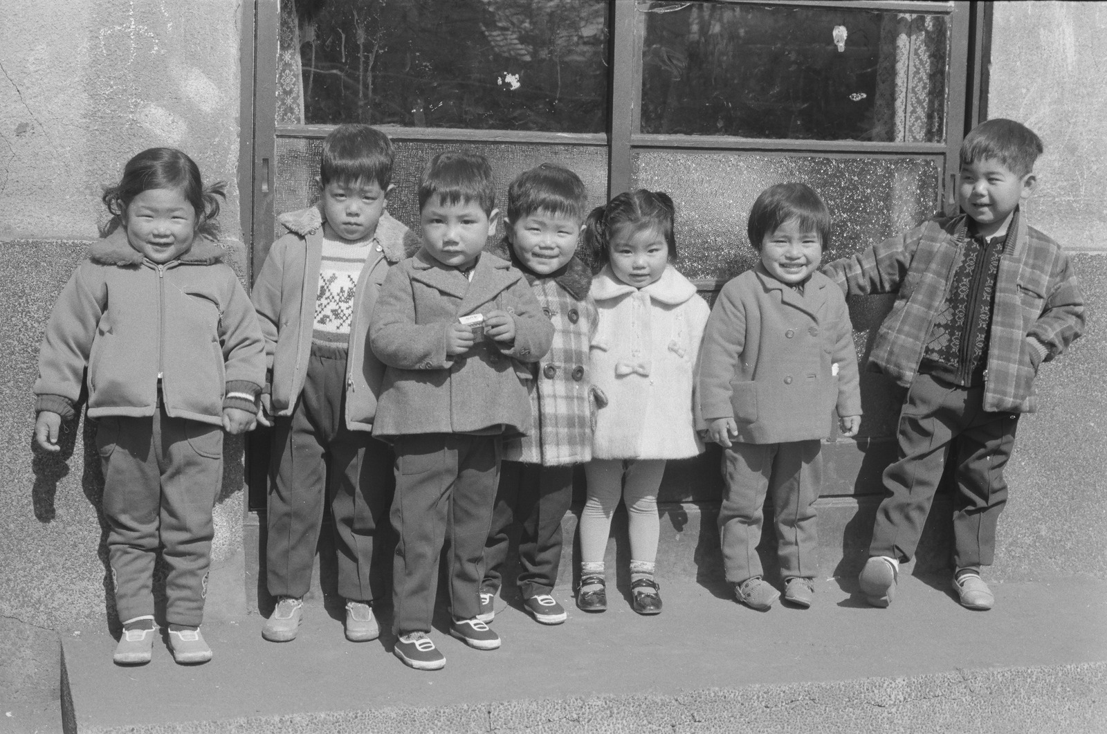 ガラス戸の前に並ぶ幼児たち。