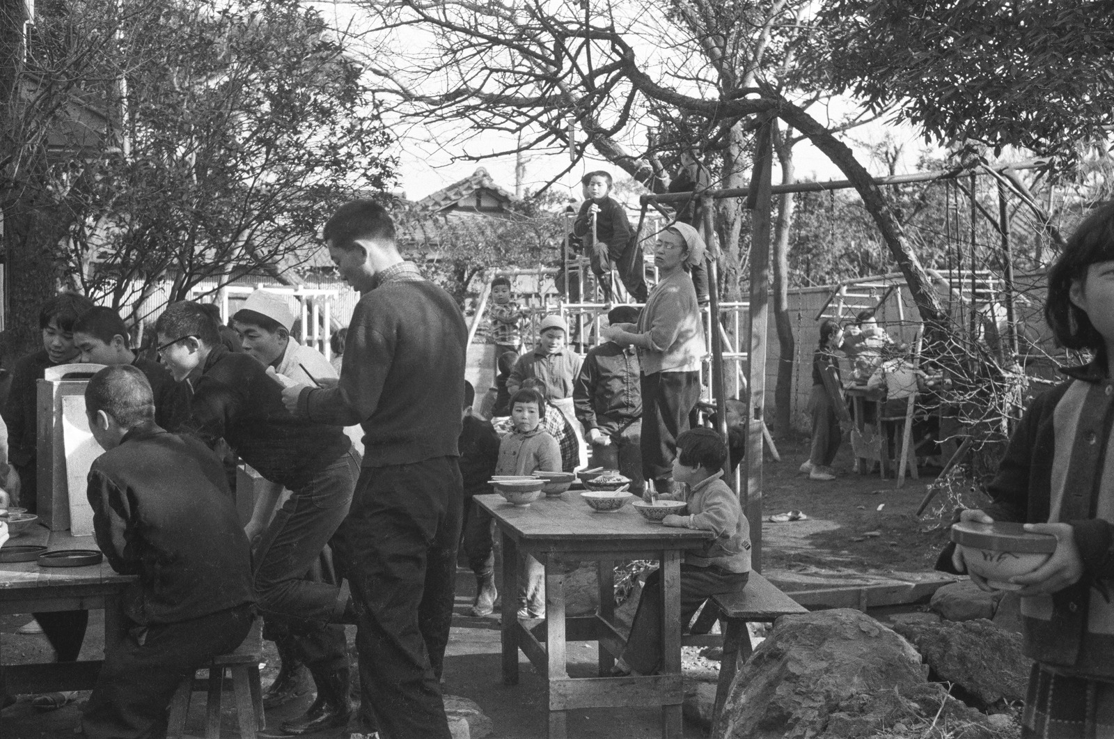 庭でラーメンを食べる子どもたち