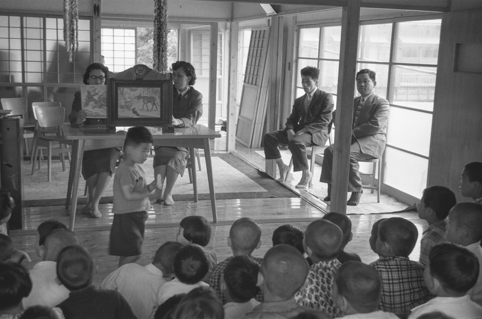 愛児の家で紙芝居を上演している人々。