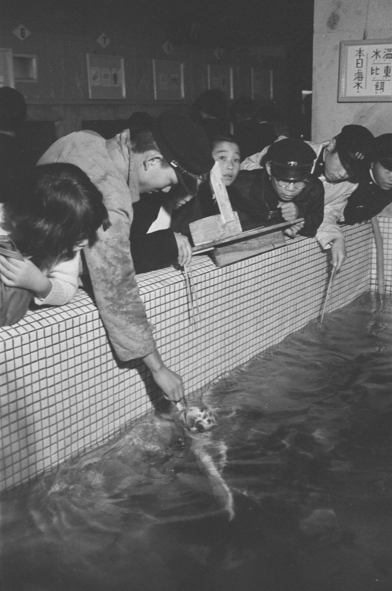 ウミガメを見る子どもたち。