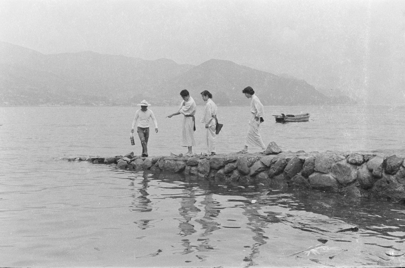 浴衣で水辺を歩く人々。