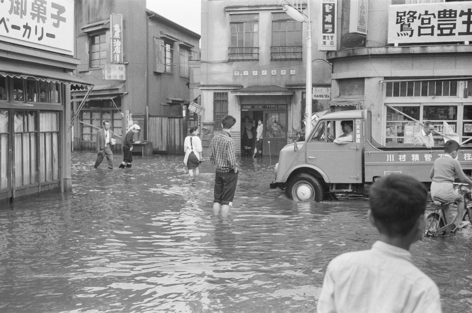 冠水した道路を走る自動車と往来する人々。鷺ノ宮駅前郵便局前の様子。