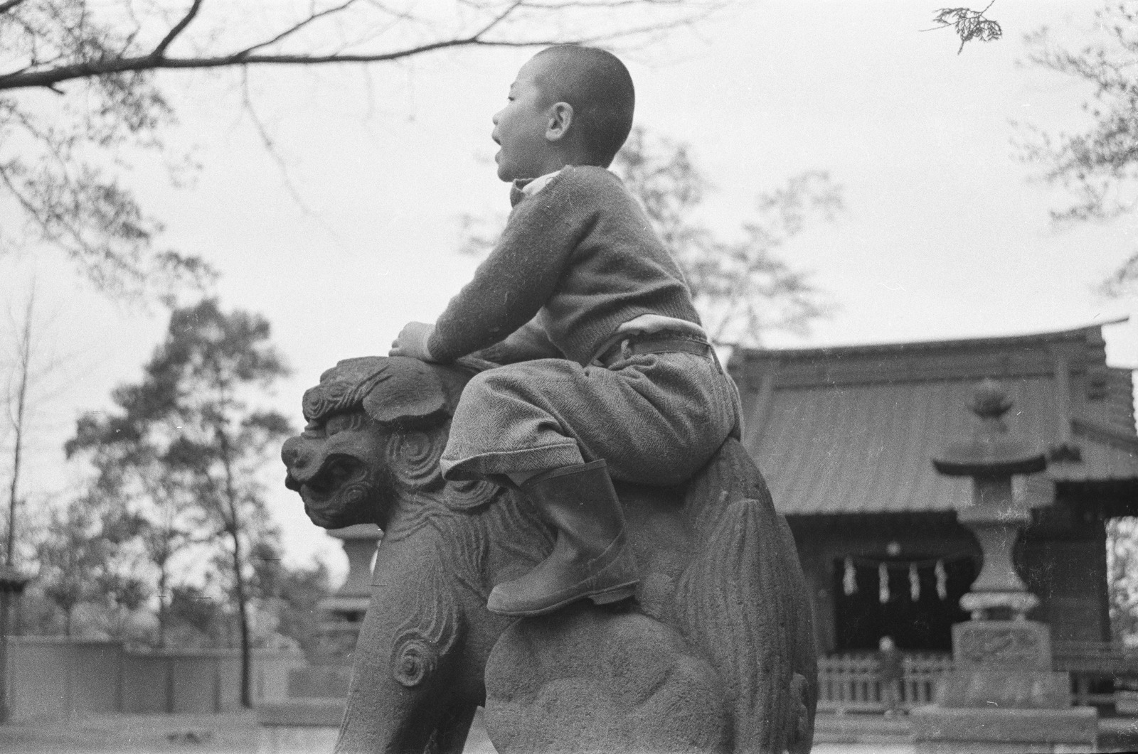 神社の狛犬に乗る男の子。