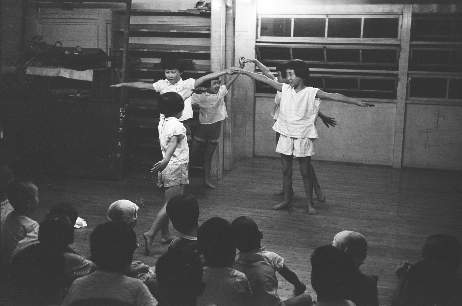 誕生会の出し物。踊るおかっぱ頭の女の子たち。