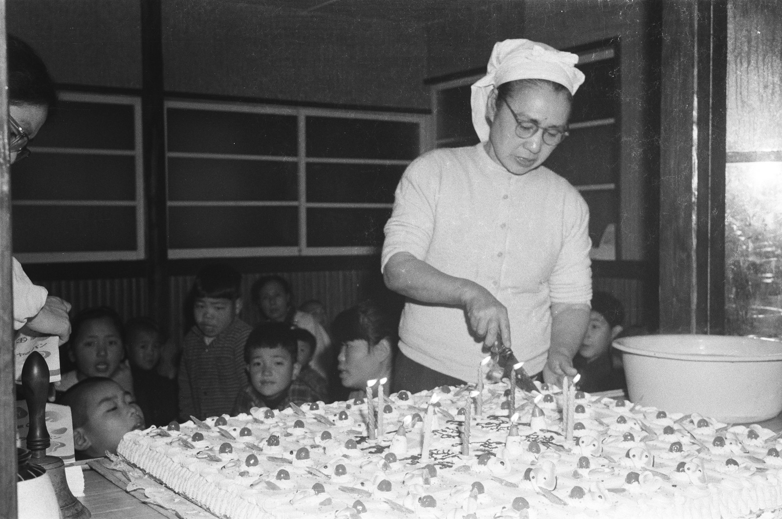 大きなクリスマスケーキを切り分ける貞代(クリスマス会)